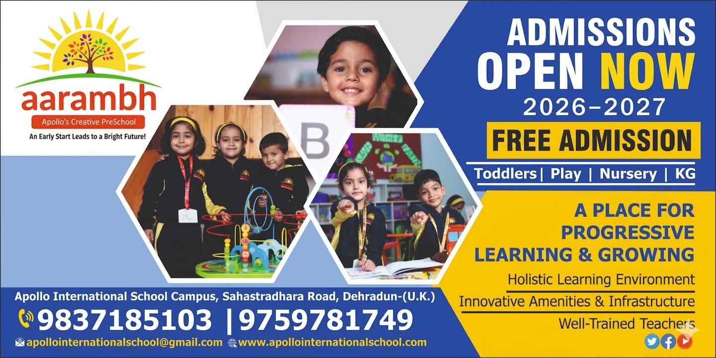 Aarambh school started its Journey in April 2022 . Apollo international School is proudly launched Aarambh School for play-group to kgs childrens. It is an English medium co-educational school recognised by Uttarakhand Government, and offers a national Curriculum in an environment that fosters excellence in school life for Classes Pre-Nursery,play-group and Kg's. It also promotes the natural ability of children to learn through development of their cognitive and thinking skills.